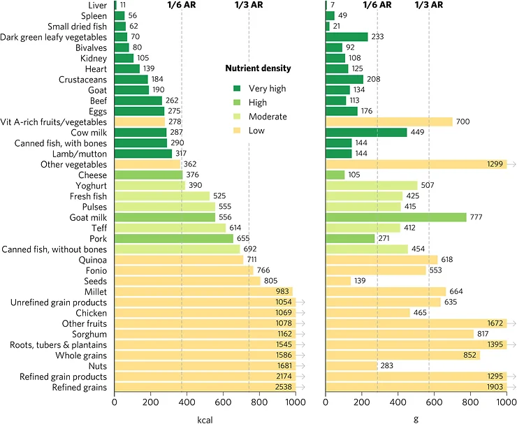 This paper written in 2022 (https://www.frontiersin.org/articles/10.3389/fnut.2022.806566/full), goes into detail and has a few charts showing highly nutrient dense foods. It seems that the most nutrient dense foods are liver and other organs. Followed closely by small, dried fish and dark green leafy vegetables.